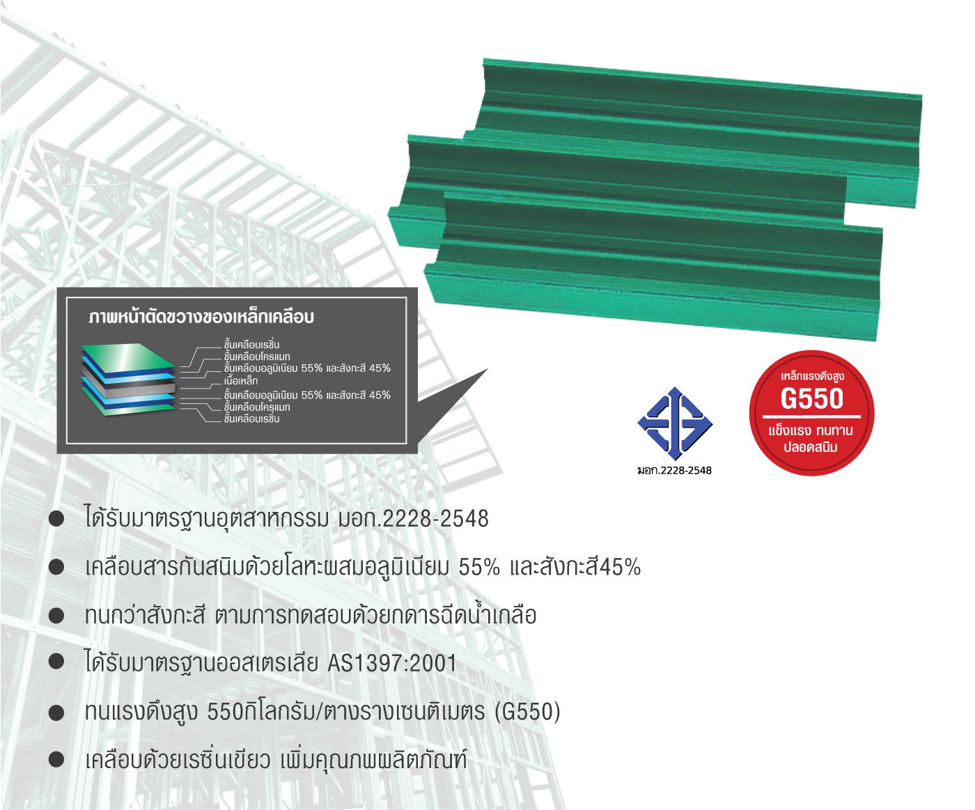 เพื่อให้ได้คุณภาพ และมาตรฐานแบบสากล โครงหลังคาและโครงสร้างสำเร็จรูป แอท-วันซ์ เลือกใช้เหล็กเคลือบจาก เอ็น เอส บลูสโคป (ประเทศไทย) จำกัด ซึ่งเป็นผู้ผลิตเหล็กเคลือบโลหะคุณภาพสูงชั้นนำของประเทศไทย
